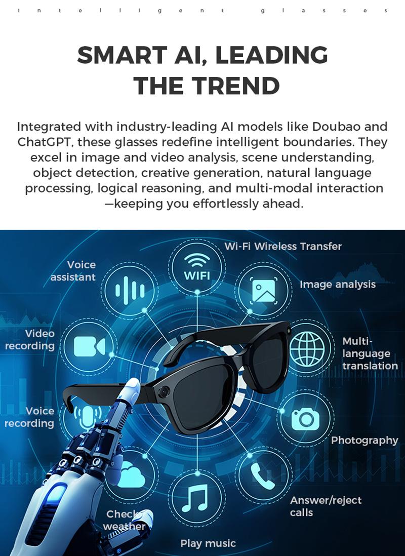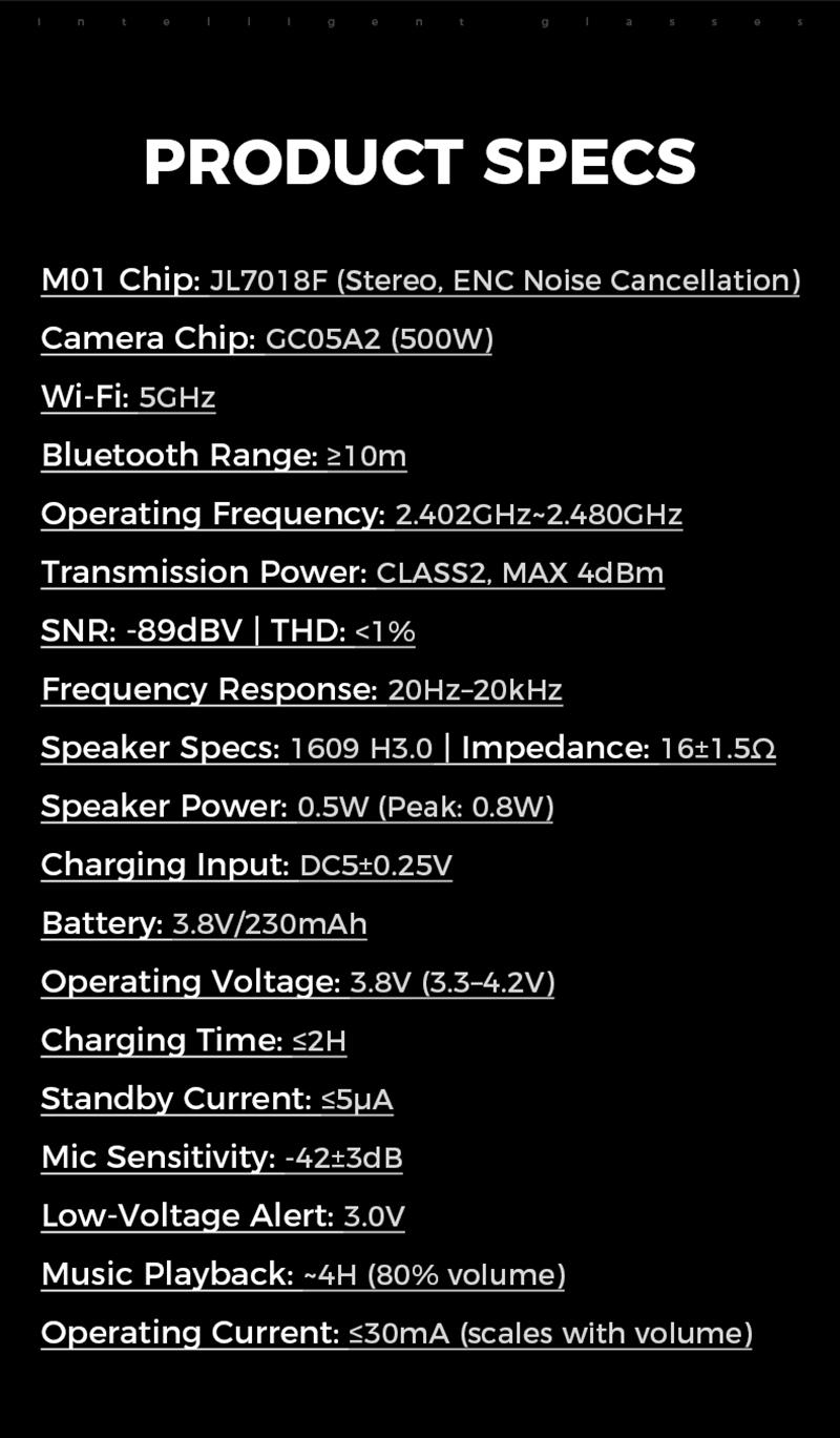 Main Functions : Wake up by voice, music playback, music control, receive calls, shooting, access to Chat GPT large model, see the picture in kind, real-time translation, etc., shooting anti-shake, wifi transmission, dual-microphone noise reduction, single-point touch, wear detection, etc.