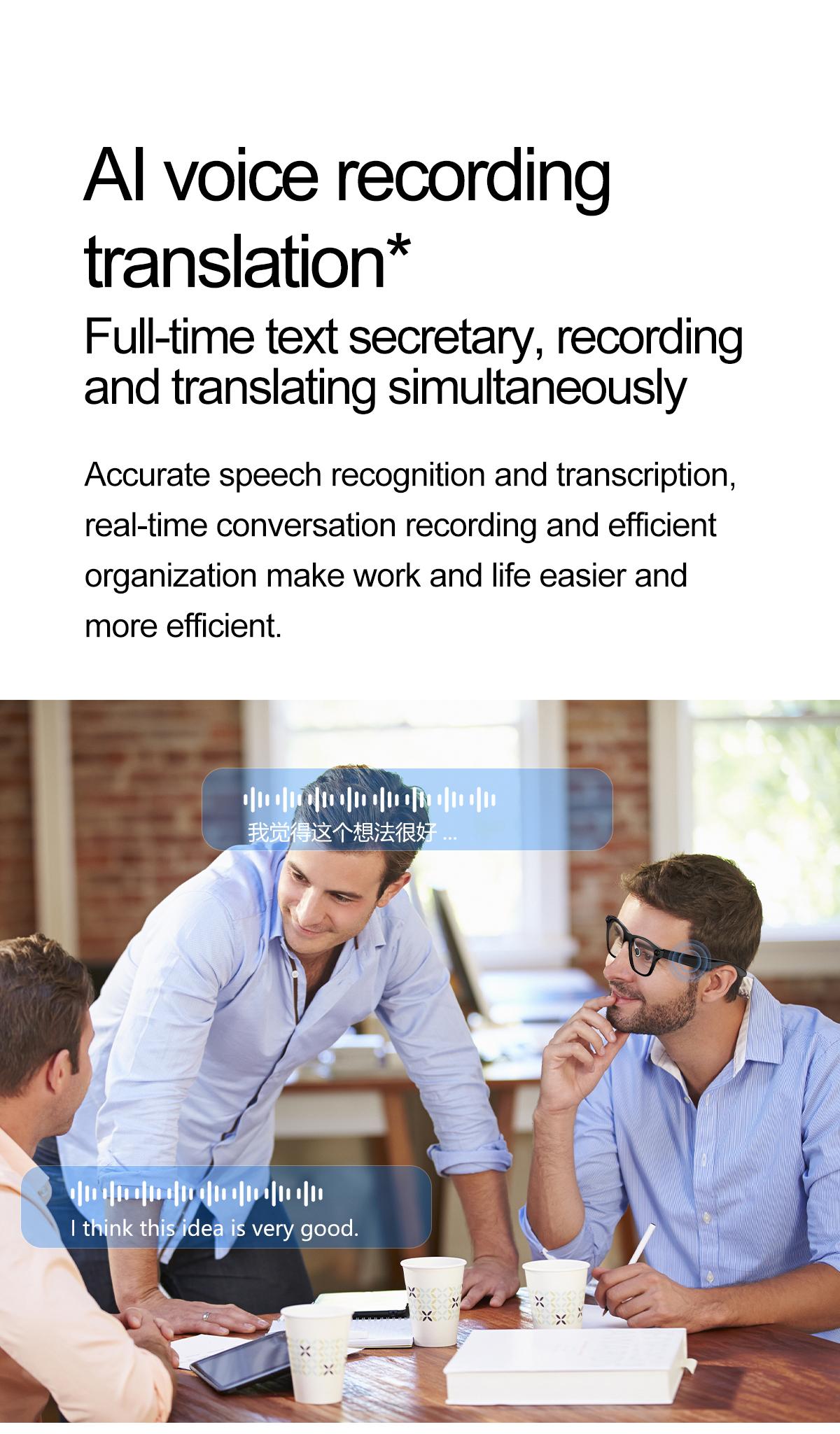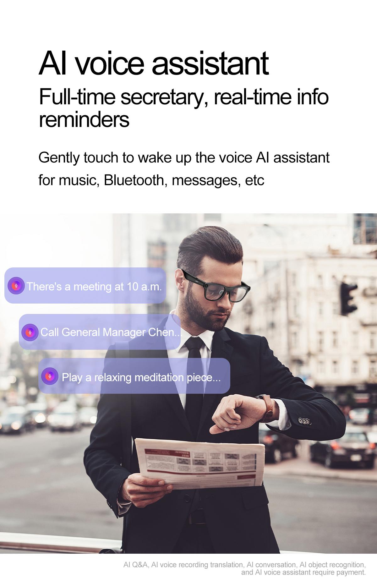 ·Video recording ·Take photos ·Recording ·Left/right physical buttons ·Indicator light ·Right mirror leg sliding touch area ·Music playback ·Voice call (built-in microphone) ·OTA upgrade ·Storage (32GB) ·ANC/ENC dual microphone noise reduction ·AI object recognition ·AI dialogue ·AI voice wake-up ·Voice translation