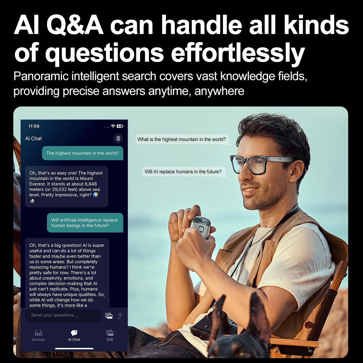 AI-Powered Interaction – Advanced ChatGPT integration for high-accuracy image recognition, AI dialogue, and question answering. Multimedia Functions – Take photos, record videos & audio, play local music (switch/pause tracks), and make Bluetooth calls. Ultra-Light & Comfortable – Only 35g with a sleek design, perfect for all-day wear. Customizable Lenses – Choose between sunglasses or blue-light-blocking lenses (myopia and other custom lenses available). Long Battery Life – 260mAh battery supports 2+ hours of continuous recording with ultra-low power consumption (no overheating). Dual Control System – Physical + touch buttons for easy operation. Durable & Resilient – IP65 dust/water resistance for daily protection.