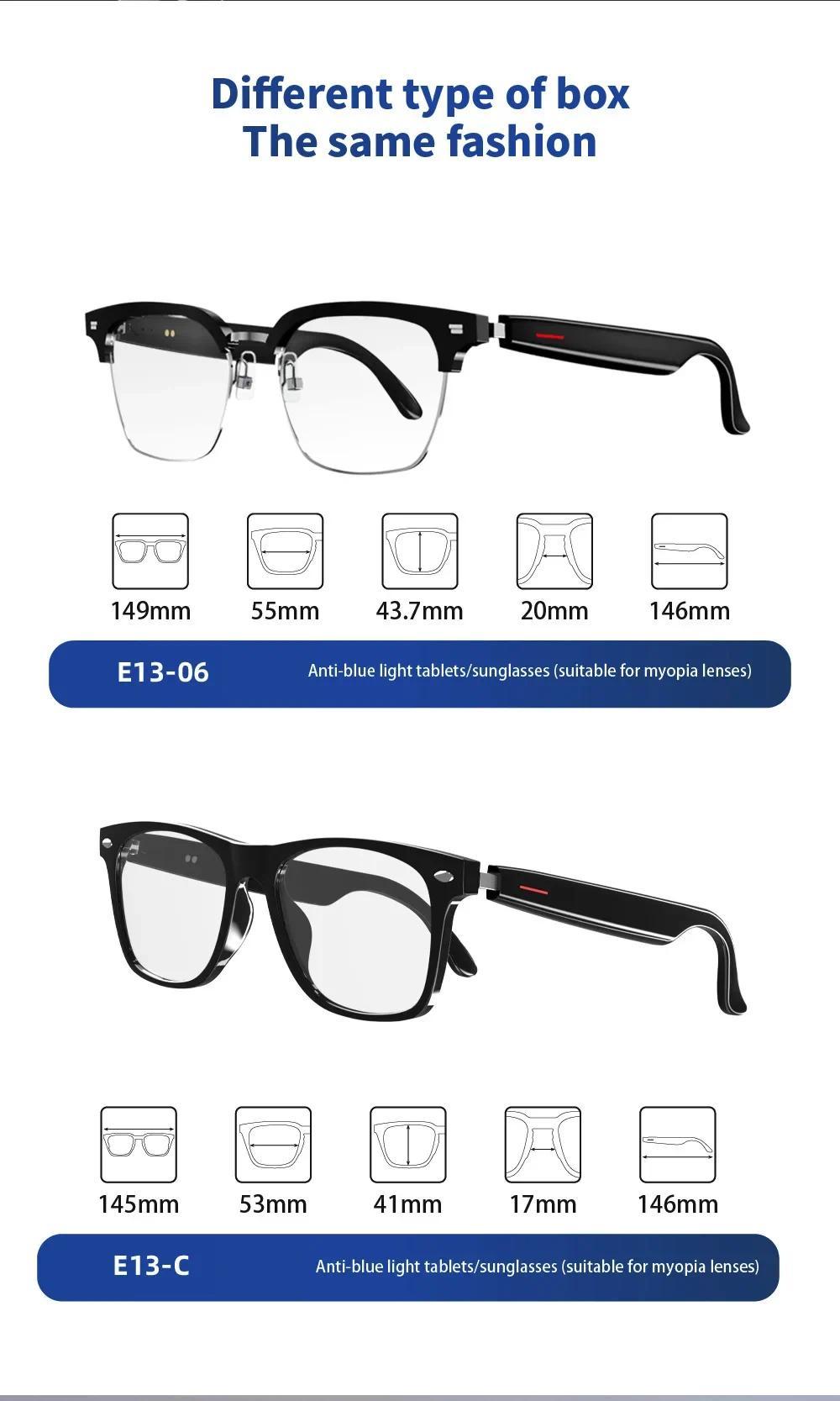 --Bluetooth-compatible glasses speaker: dynamic drive, unique sound cavity design, avoid hearing impairment --In-ear design helps you keep an eye on your surroundings, avoid danger and enjoy music --Open solution: allows you not only to listening to music, answer calls, but also to hear notifications from glasses, while listening to the world around you --The sunglasses have built-in noise-canceling microphones that allow you to make and receive calls --Transmission distance: 33 feet (10 meters) Description: Product : Smart Glasses Lens: anti-blue light lens; Lens material: acrylic; Frame material: ABS+PC; Speaker type: dynamic speaker; Microphone: -40dB±3dB; Compatible profiles: A2DP, AVRCP, HSP, HFP; Transmission distance: 33 feet (10 meters); Battery: Rechargeable Li-ion 75mAh; Continuous playback: 3-6 hours (normal volume); Standby time: 10 days; Charging time: 2 hours; Waterproof grade: IP7; Bluetooth-compatible version: CSR5.0; Working temperature: -10°C-+50°C Humidity 0-90%; Packing list: 1 x Bluetooth-compatible glasses 1 x USB cable 1 x glasses cloth 1 x instruction manual 1 x packing box Note: 1. Due to manual measurement, please allow 1-3cm error. Make sure you don't mind before bidding. 2. Due to the difference of different monitors, the picture may not reflect the actual color of the product. Thanks.