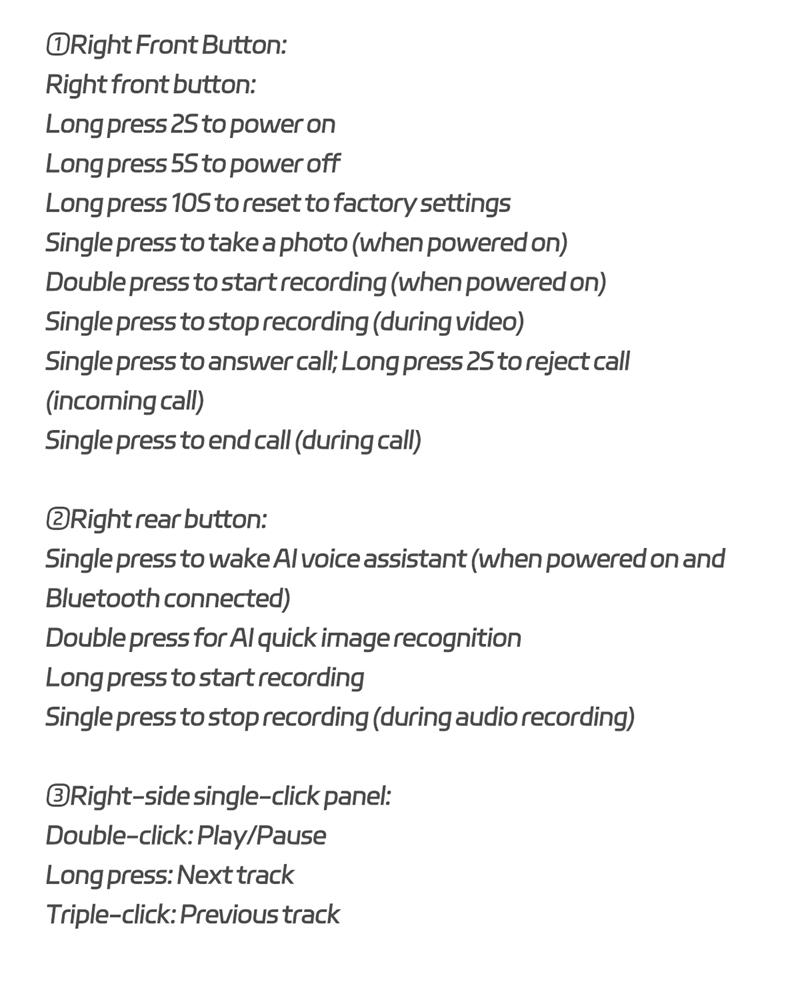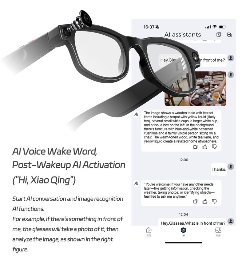 Functions: Camera function (photo taking & video recording), WIFI image transmission, sound recording, AI translation (support 100+ languages), AI photo recognition, AI intelligent question & answer interaction, wireless call (answer & reject), voice assistant (AI voice wake-up), built-in headphones & speaker (stereo sound), music playback, anti blue light, UV protection.