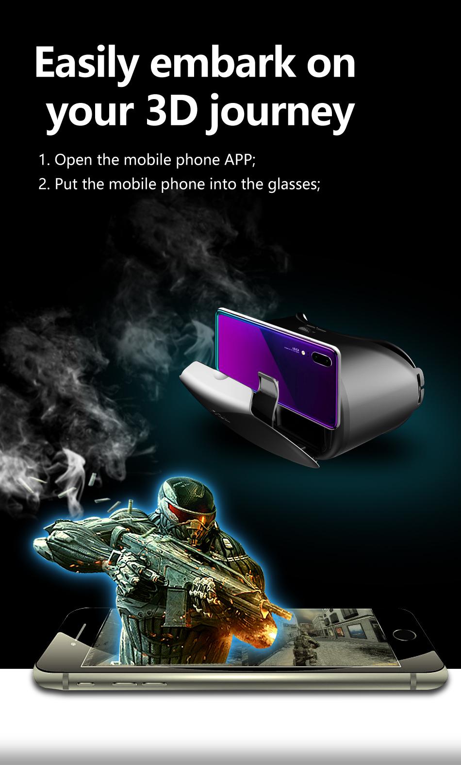 Features: -This product is a 3D glasses that integrates watching movies and playing games. It can turn a mobile phone into a movie theater/3D game hall. The product does not need to be charged. Put the mobile phone into the glasses to watch 3D movies online. -Super-large phones can be switched, both large-screen and small-screen phones can be used, compatible with iPhone & Android phones. (Maximum support 7-inch screen phones). -120-degree wide-angle lens, super large viewing angle, watching movies is more enjoyable and immersive. -With improved clarity, it can be used in conjunction with the handle to watch high-definition movies and experience the panoramic immersive 3D world. It is a perfect gift for children and adults. -Lightweight body, the appearance is not only simple and atmospheric, but also easy to carry, a new upgrade. Package Includes: 1x VR Headset( AA Battery is not included) 1x Cleaning Cloth 1x Manual Specifications: Material:PC Support Mobile Phone: 5-7 inch Smart Phone Myopia Support: Both eyes can be adjusted independently within 800 degrees. Lens: High-definition Blue Light Coated Lens/Non-coated Lens Interpupillary Distance: 58-75mm; Focal Length: 53.3mm Horizontal Field of View: about 120 degrees Size:Approx.18x13.5x10cm/7.09x5.31x3.94in Net Weight:260g Note: Please allow 1mm errors due to manual measurement. Due to the difference between different monitors, the picture may not reflect the actual color of the item.