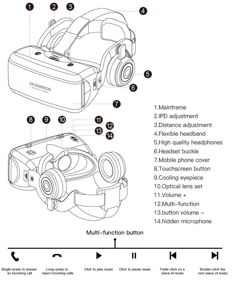 1. Material: ABS +40MM resin Lens; 2. Lens: Aspheric optical lens, high transmittance ; 3. Video format :left-right 3D ; 4. FOV: 90-100 5. Weight: 300g~350g; 6. Focal distance : Adjustable ; 7.IPD: Adjustable 8. Color: Black 9. Faceplate: flocking fabric + sponge + velcro; it is replaceable 10. Phone stand: 4.7-6.1 inch smart phone; 11. Accessory: Eye glasses cleaning cloth, user manual 12. Short-sight suitable: 0-600