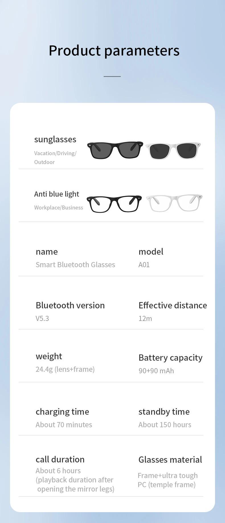 • Model: A01-C • Bluetooth Version: 5.3 • Control Method: Touch • Effective Range: 12 meters • Speaker Size: 16x9mm • Battery Capacity: 90mAh(each side) • Music Playback Time: 6 hours • Call Time: 5 hours • Charging Time: 70 minutes • Weight: 34g
