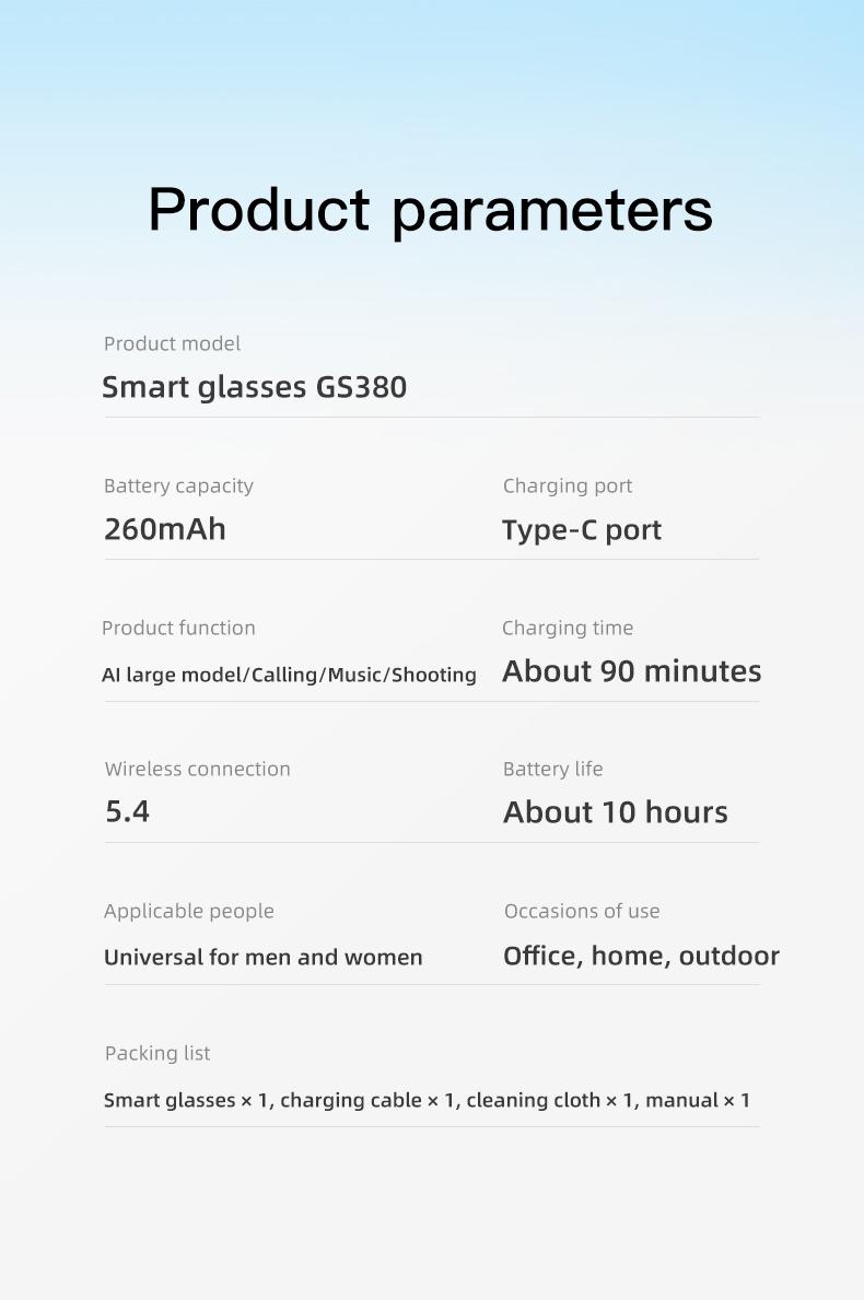 Product Model:GS380 Bluetooth version:Bluetooth 5.4 Low Energy Chip:BK7258 Battery:260mAh/3.8V Standby time:15days Battery life:Over 10 hours Charging time:About 90minutes Charging way:USB+Type-c material:Plastic PC + ABS Watch size:176*153.5*49MM System:Android 9.0 and above, IOS 10.0 and above