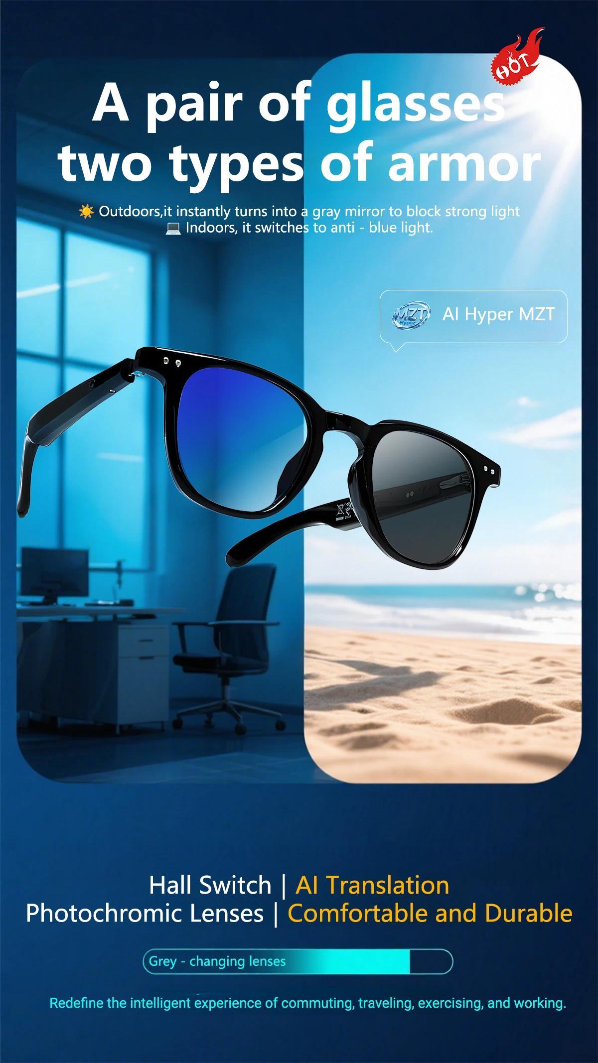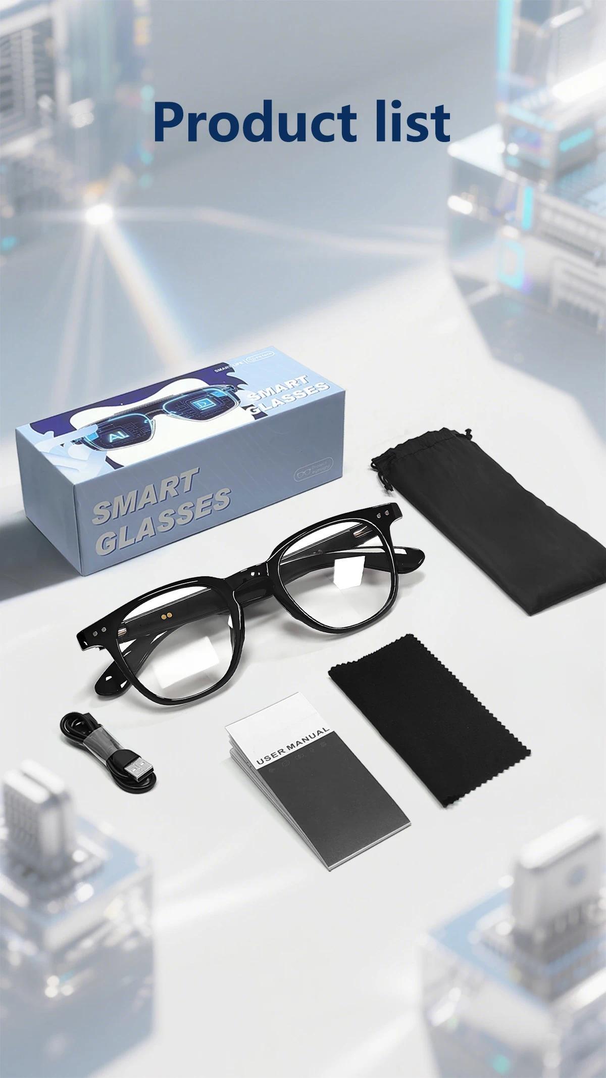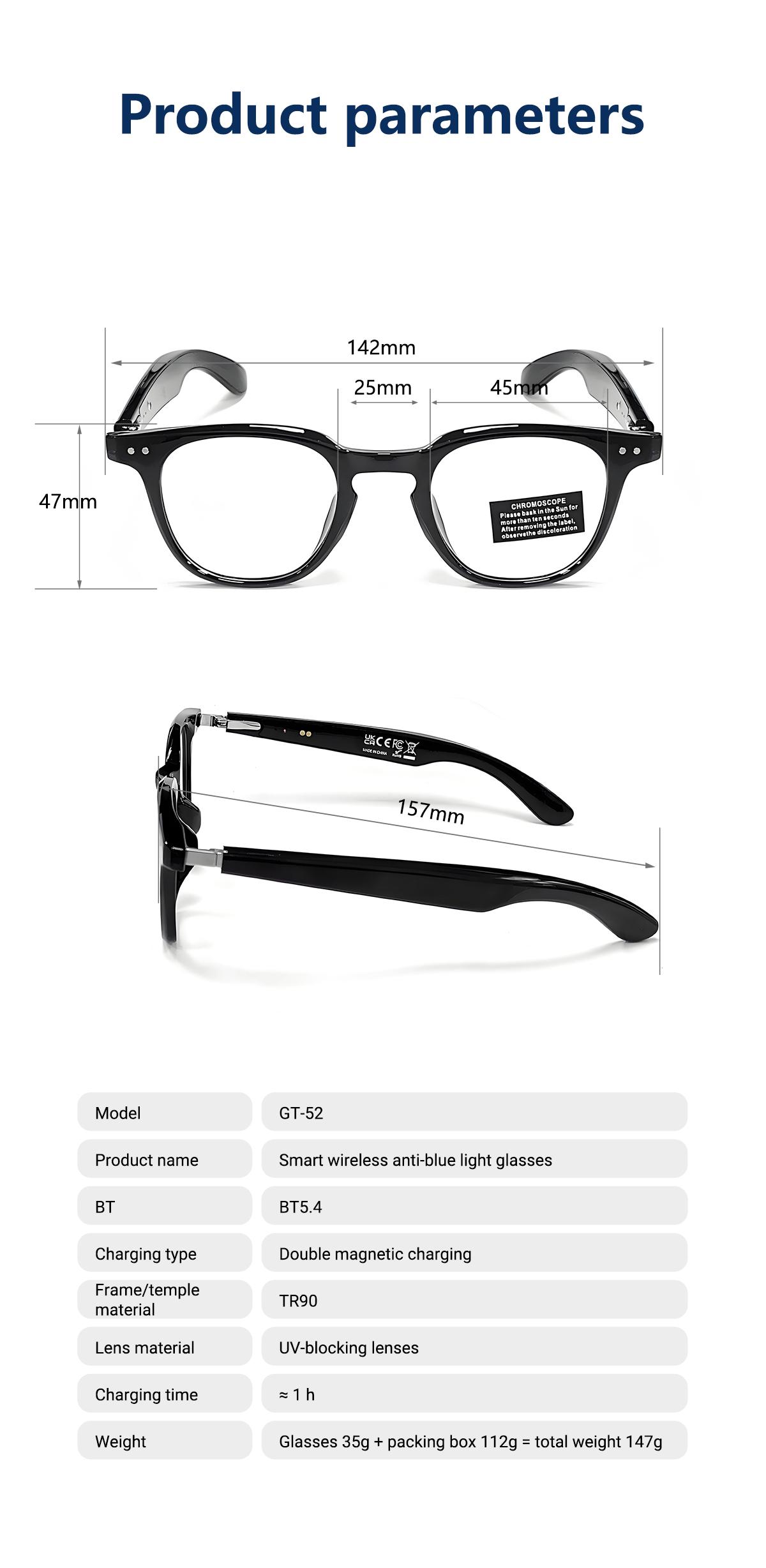 Main control chip:AB5636H Battery :50mAh+50mAh Charging way:Magnetic charging Bluetooth version:BLE5.4 Bluetooth protocol:A2DP,HFP Mode of operation:Touch Transmission distance :10M Waterproof level :Life waterproof Material :ABS+TR90 Voltage :DC5V Electric current:50mA*2 Play current (max volume):22mA Standby current :1mA Lens Material:Anti-blue light photochromic gray lenses lens Size :170*70*52mm Weight:Glasses35g + packing box 112g = 147g Outer box specifications :390*360*280mm 50pcs/8.2KG Language English Functions:Bluetooth calling/music playback/games/multi-style menu/voice assistant/weather/remote camera LENS EFFECT :Anti-blue light/Anti-glare Packing:Smart Glasses charging cable, storage pouch, cleaning cloth, user manual, packaging box