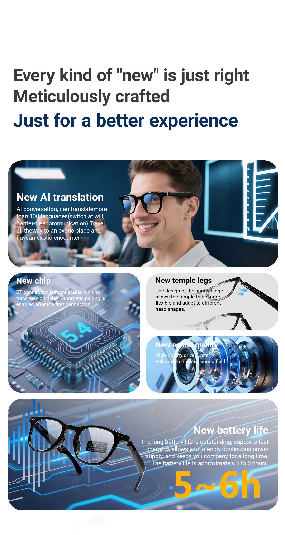 *AI Bluetooth Audio Call Fashion Smart Glasses: Equipped with functions such as AI intelligent voice and video real-time translation, AI dialogue and Q&A, AI intelligent translation (including translator mode and the translation mode combining glasses and mobile phone, which can customize the translation of more than 163 languages)